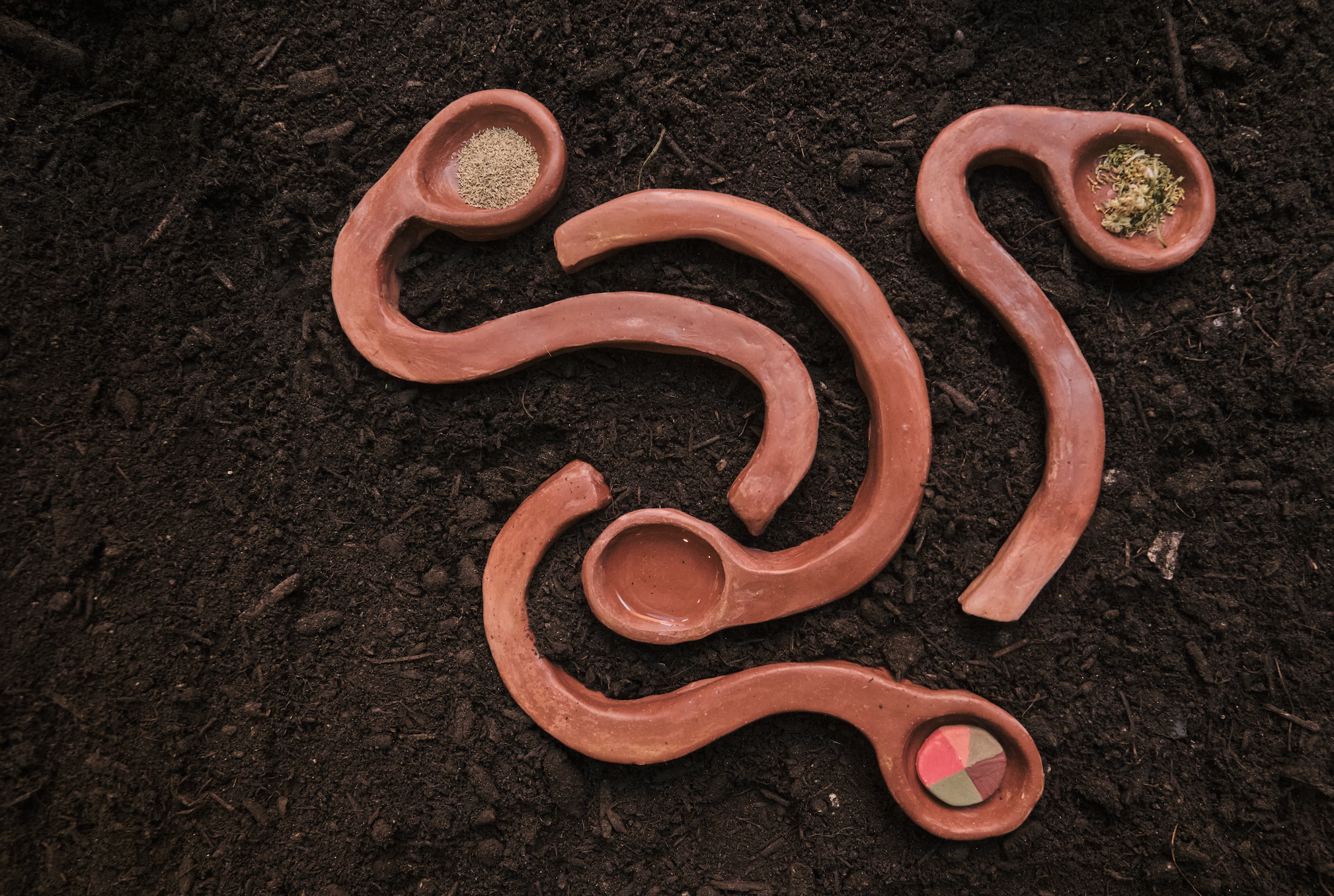 Raw burnished red clay, beeswax, mugwort leaves, mugwort seeds, mugwort flower essence