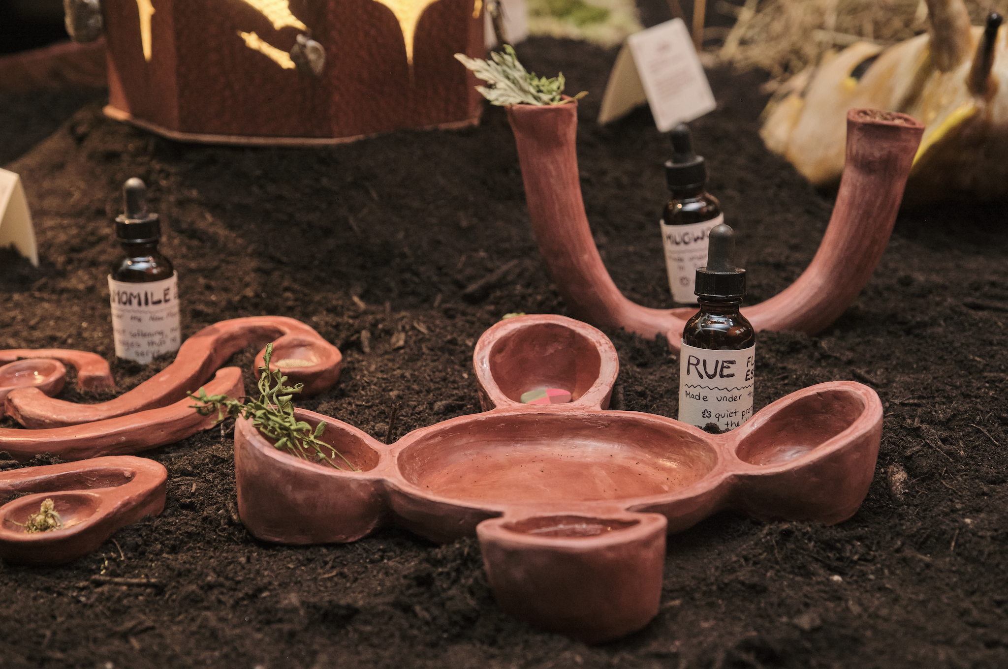 These works take the form of altars—odes to the intimacy and kinship cultivated with three plants during the past farm season: Rue, Chamomile, and Mugwort. While in full bloom, each plant was prepared as a flower essence, its energetic imprint held in water, allowing the relationship to persist in another form.